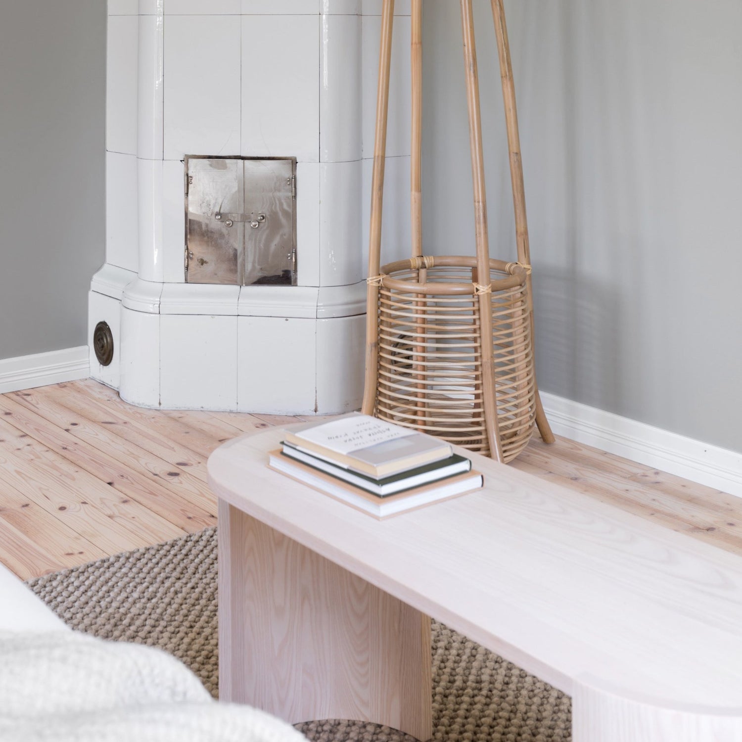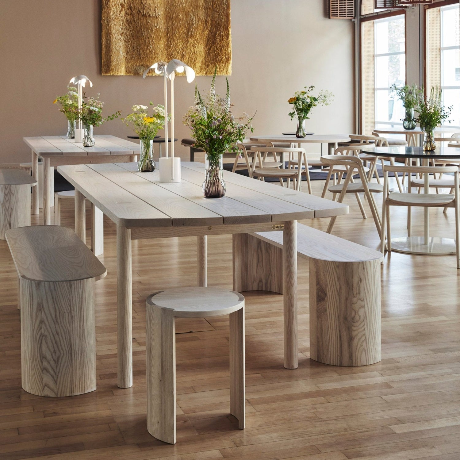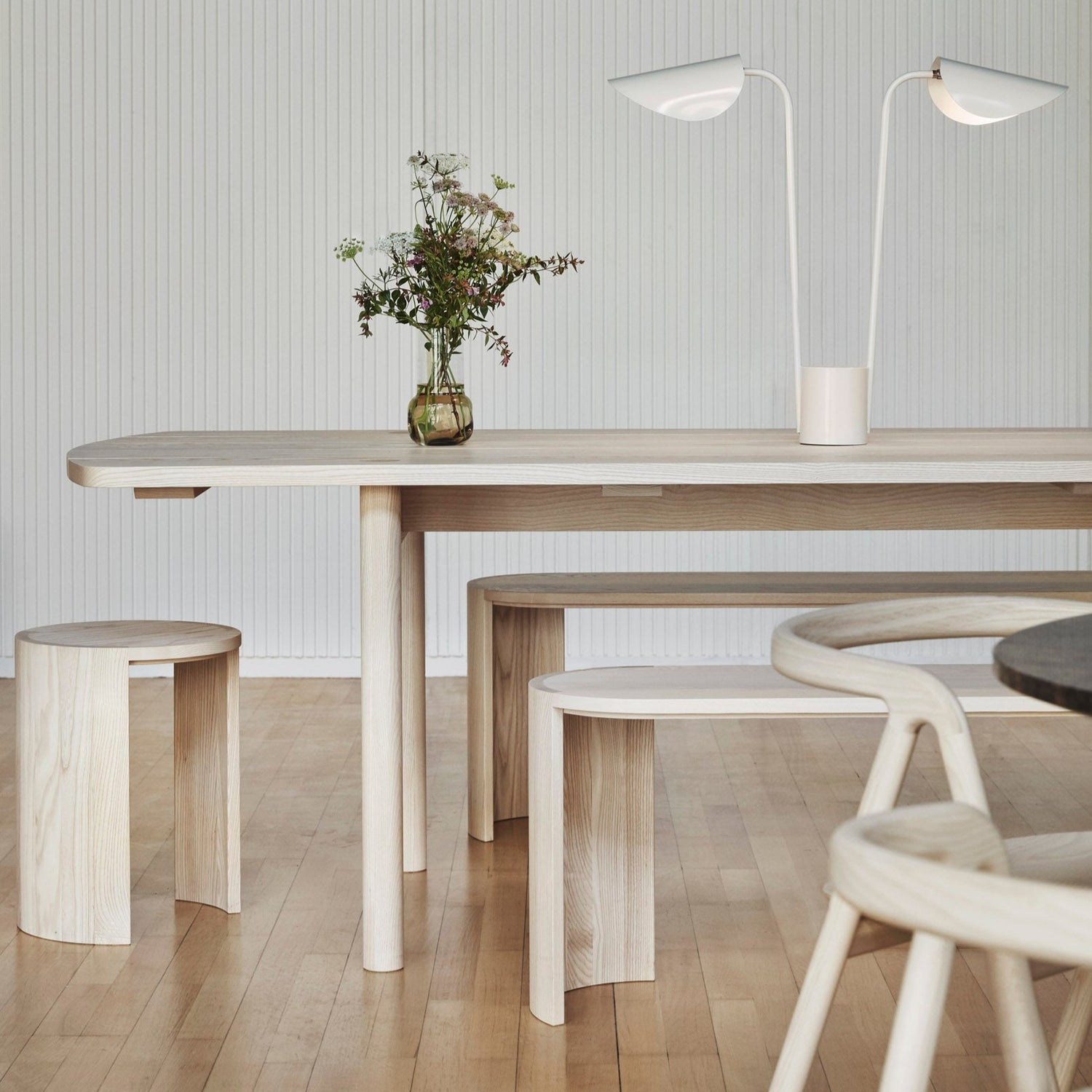The Airisto bench features soft, rounded shapes and an asymmetrical foot structure. Made of durable ash wood, the minimalist and multifunctional piece can be used as a side table, stool and a bench.